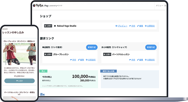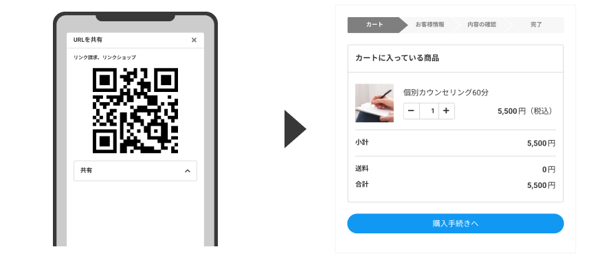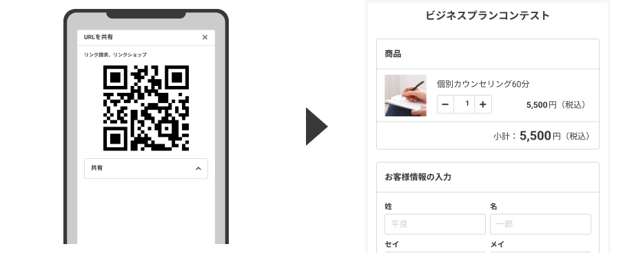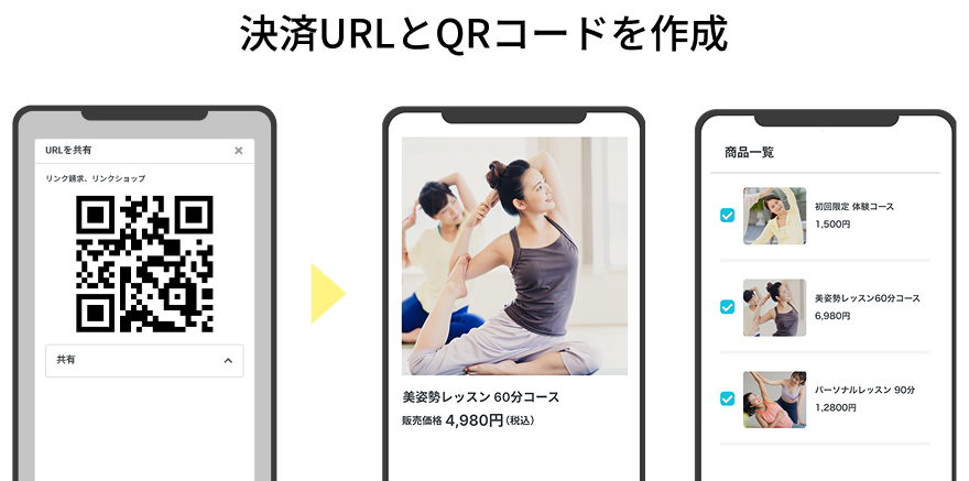決済用のURLリンクや二次元コードを手軽に作成し共有することで、販売ページがなくても請求・支払いができます。